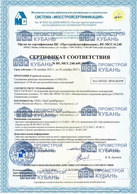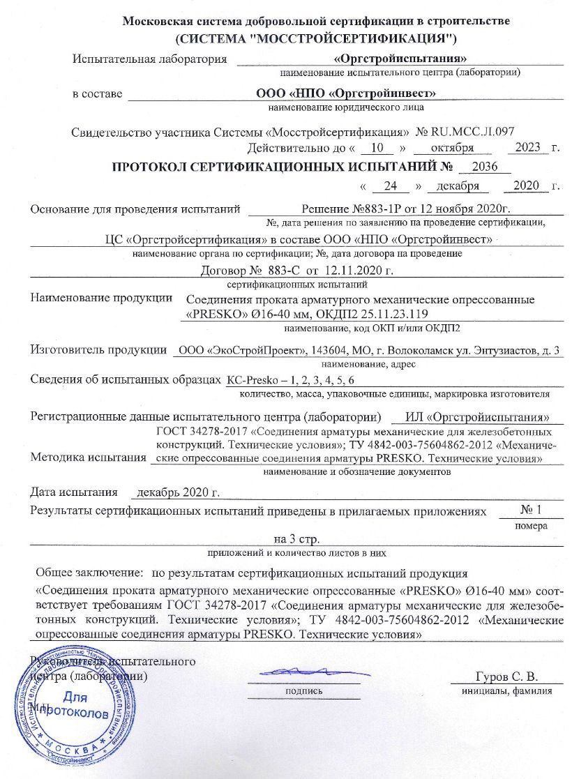 Стальные обжимные муфты «Преско», производимые группой компаний ПСК, изготавливаются на собственном производстве и проходят регулярные испытания на прочность и разрыв. Все изделия сертифицированы и соответствуют требованиям российских и международных стандартов.